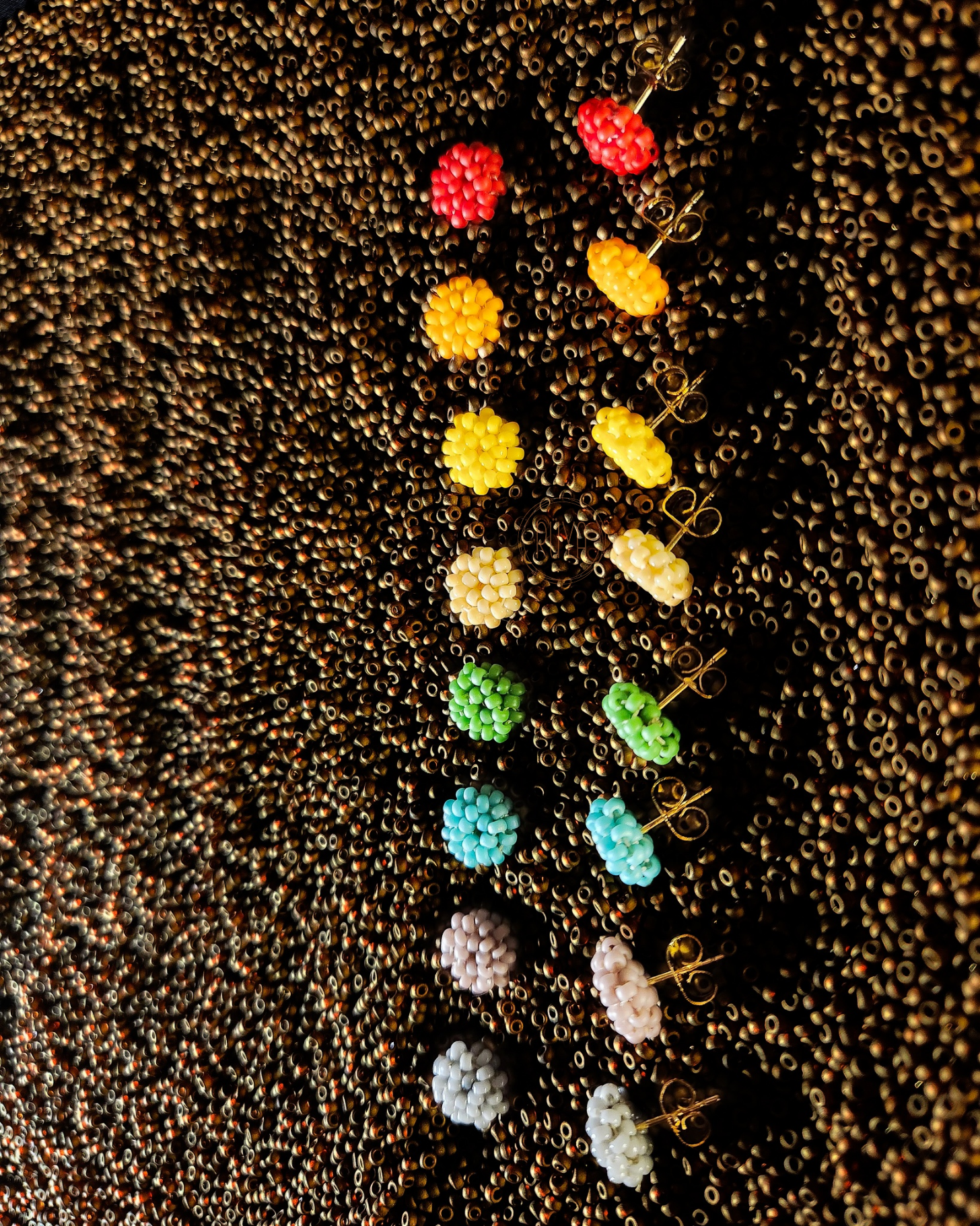 Set de 8 topos pequeños, tejidos a mano con mostacilla japonesa en colores vivos y acabado opaco. Incluye 8 colores diferentes